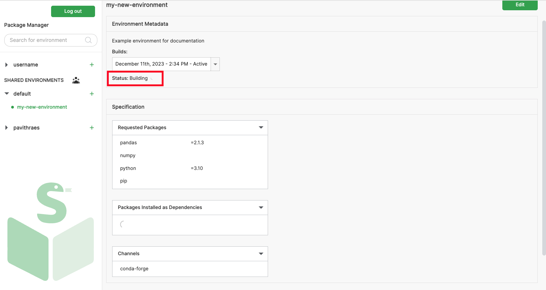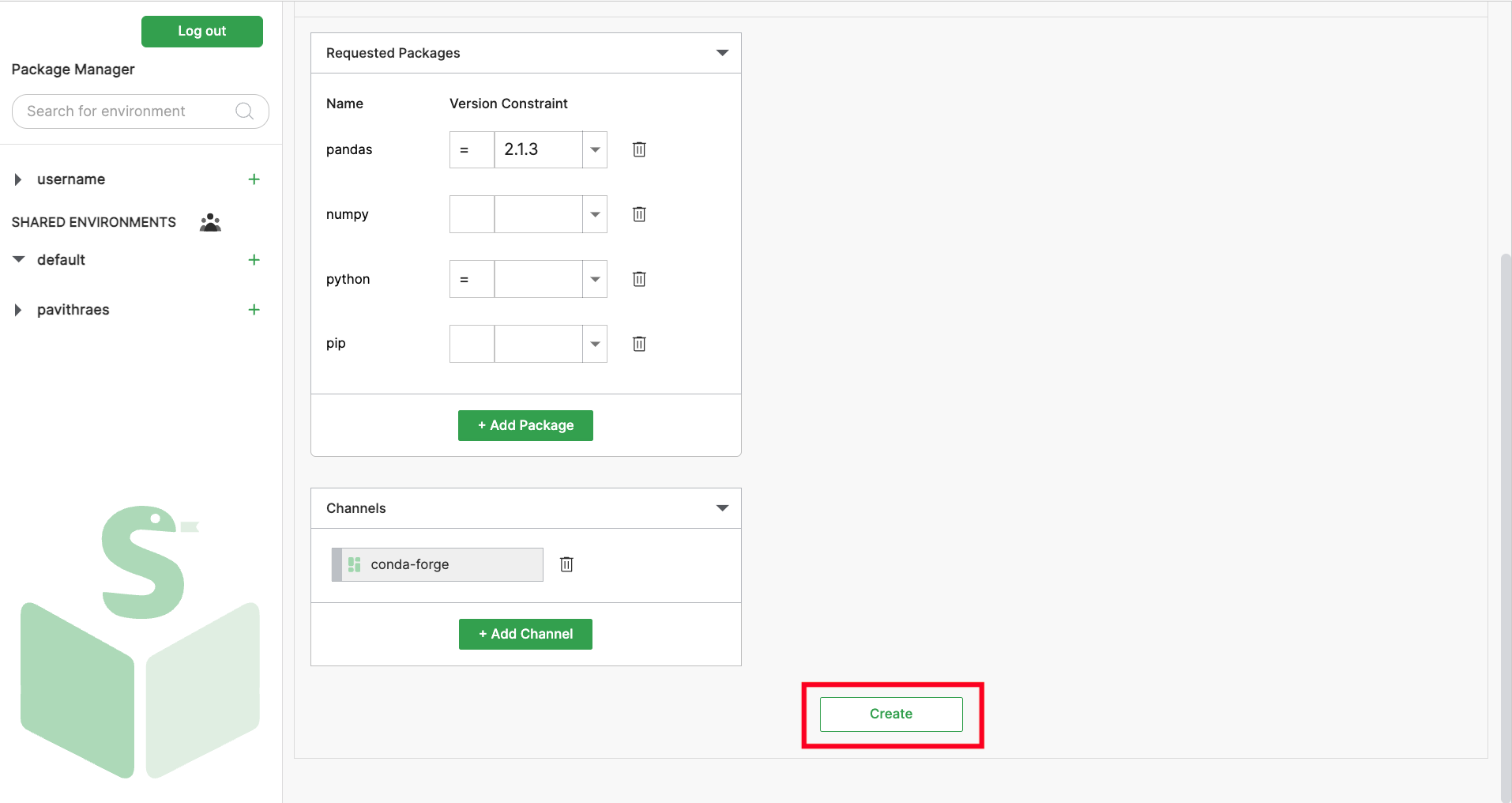 Once the name, description, required packages, and channels are specified, click on the "Create" button at the bottom of the screen to trigger environment creation: