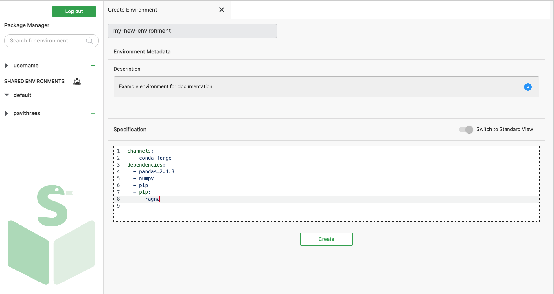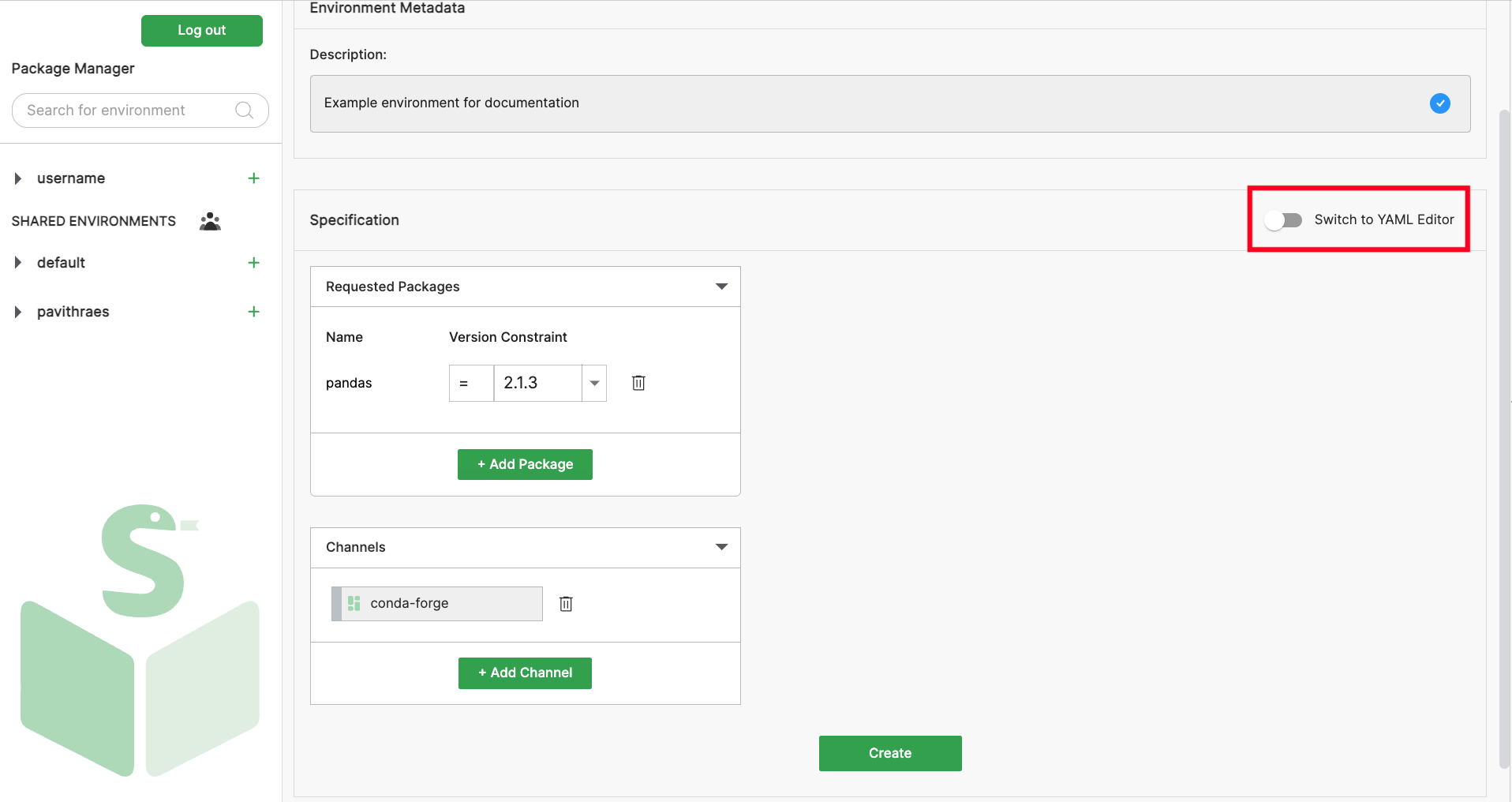Alternatively, you can use the YAML editor to create environments. This approach is recommended for users familiar with conda's environment.yml specification or for users who need to use pip to install some packages.